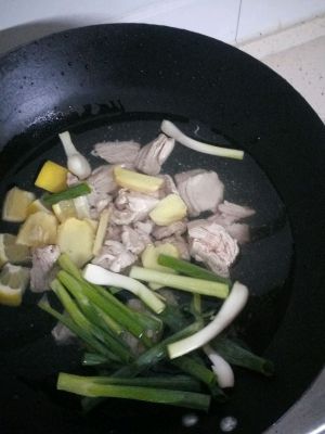 把准备的食材,葱段,姜片,柠檬块,里脊肉块放入锅中,加入酱油,盐,冰糖,香叶,八角。大火烧开,小火慢炖至40分钟。