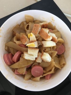 我最后加了给儿子做三明治剩下的香肠和切片面包的边角,也很好吃哟