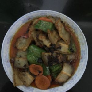 锅内少许油,热油放入姜片,放入五花肉片煸炒。