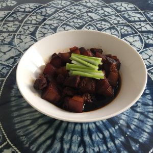 五花肉洗净、切块,加冷水、姜3片、料酒少许浸泡1小时冲洗,再冷水下锅焯水,开锅5分钟后洗净控干。