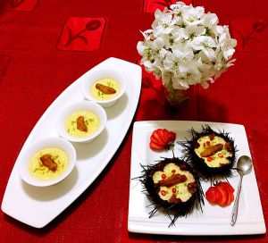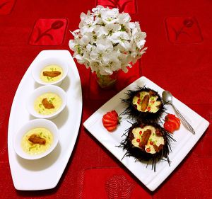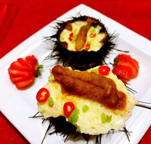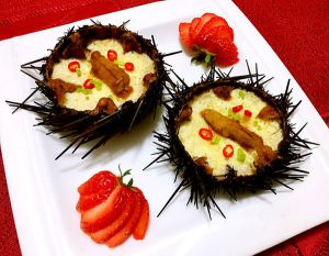 这一步是最费时间也是最辛苦的一步建议亲们带个胶皮手套手套否则会把手染成黑褐色用剪刀将海胆外壳剥开去除海胆的内脏清洗干净
