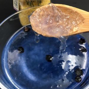 同样是准备一小碗矿泉水,(一定要用矿泉水哦,不然泡出来的糖浆不是蓝色的)把黑枸杞和冰糖都加入到水里,搅拌,水就会变成这个样子哦,是不是很美很美。