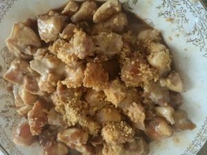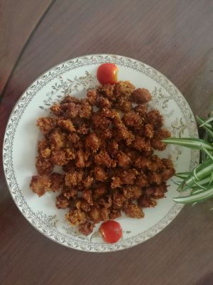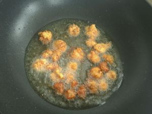 锅里放色拉油,待油温8层热时放入沾上面包糠的鸡脆骨小火炸,注意小火,不然会糊滴。