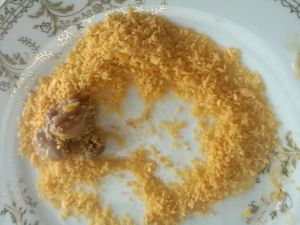 再把挂糊的鸡脆骨放到面包糠里滚一下。