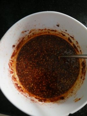 烧开的油浇在上面,要下边浇一边搅,放一点点的盐