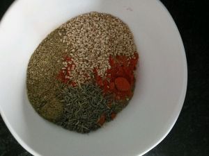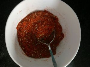 孜然粉,辣椒粉,熟芝麻,又放了一点点孜然