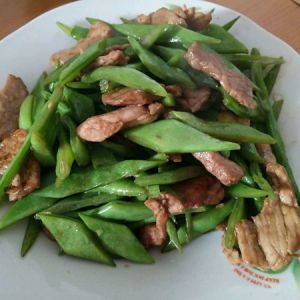 四季豆过水煮熟切好。肉切片,腌好,辣椒切段。