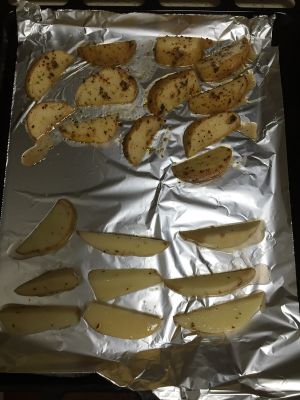 烤盘铺锡纸,将拌过的土豆块摆好。我留了一半没放辣椒的给孩子