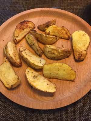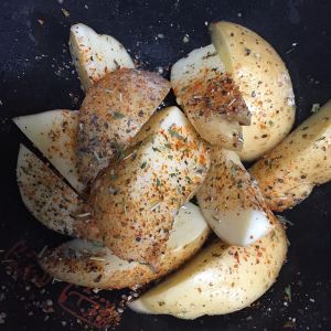 土豆用刷子刷干净,切斜块儿,用厨房纸吸干表面水分所有材料及橄榄油,拌匀