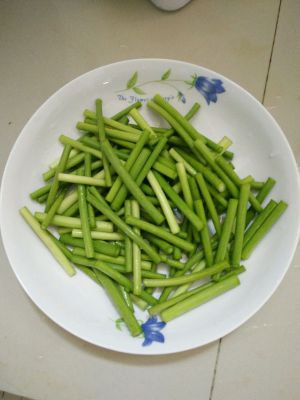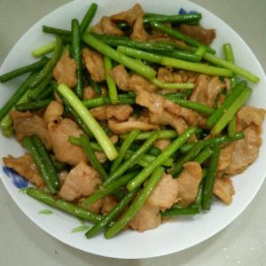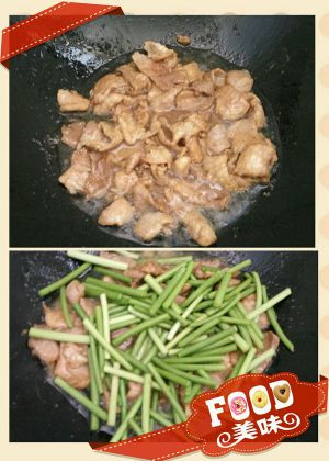 热锅放入适量的油,倒入腌制好的瘦肉炒至变色,加入蒜苗快速翻炒,再加入少许盐,炒至1-2分钟即可。(我倒油不小心倒太多了,不过我还要炒其他菜,就没理会它)