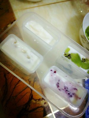 一个冰淇淋模具,把水果切一些薄片(如果你是颜控)再切一些果粒,薄片贴在模具上(吃的时候很好看)就这样一层酸奶,一层果粒,直到模具装满。装蓝莓味的时候步骤同样,不过如果你是颜控,在装满之后用一支筷子搅一搅,这样脱模之后中间会有漂亮的大理石花纹!!