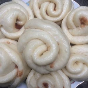 前后在把铺好的面团皮卷起来,从中间切开后就是这样啦!在然后吗上锅蒸15分钟后不着急忙接来,在让它在里面呆五分钟