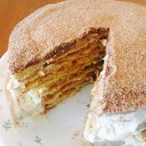 再放一张饼,抹奶油馅,加入饼碎直到最后一张。