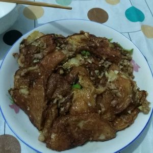 待肉末成熟后放入先前炸好的茄子,翻炒片刻加入盐调味即可!