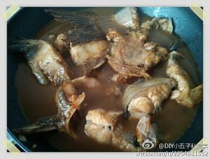 鱼变色后加水,大火烧5分钟后改小火慢炖。