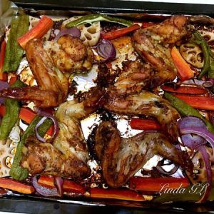 烤盘铺好锡纸后均匀地摆好鸡翅在烤盘中心,再将青椒、胡萝卜、洋葱、藕片等自己喜欢的蔬菜摆放在鸡翅周围。