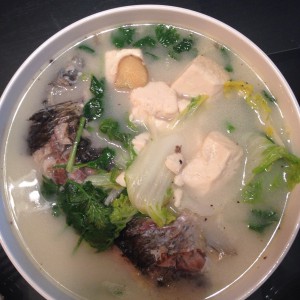 汤锅烧开水,放入豆腐 鱼 葱,大火炖10-15分钟,全程大火才能保证汤是奶白色的