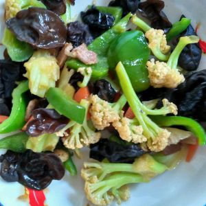 锅里放油烧热 放入蒜再放入肉炒的发白之后放胡萝卜菜花青椒炒同时放调料 最后放木耳