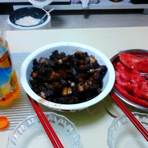 炒的有些变色,表面微熟,加水,放葱,姜,花,大料,盐,味精