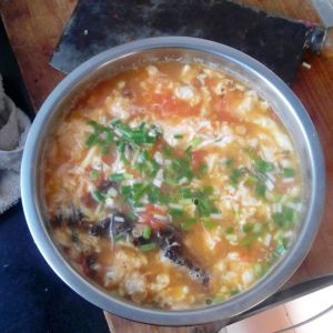 把紫菜撕碎先丢尽锅里,番茄汤煮沸腾,以圈形式,倒入蛋花,等待10秒,用锅铲,从外往里推动汤两三次,不要推多了,不然蛋蛋就成花沫沫了╭(╯ε╰)╮,关火。