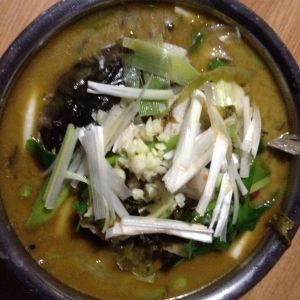 加适量的油加热,放入蒜头,辣椒,酸菜,炒香,加入适量的清水