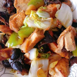 加油,葱姜花椒,青椒爆炒后,放入木耳,白菜炒,加酱油生抽,盐,两分钟后放入豆腐,加少量水,煮2~3分钟入味即可