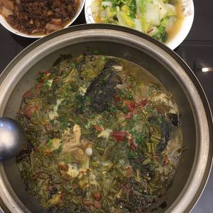 锅里煎鱼的油烧热,将干辣椒,大蒜,蒜苗,姜,豆瓣酱放入,煸炒出香味,放入酸菜一起炒。