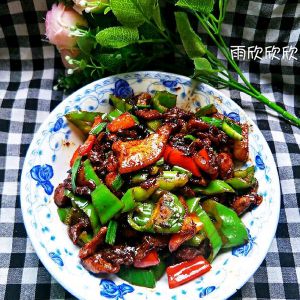 放入青红椒继续翻炒。沿着锅边淋点酱油。