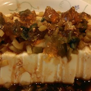 豆腐表面摸一层薄盐,摆上切好的榨菜和皮蛋,浇上放凉的辣椒油,放入用糖,醋,鲜酱油调好的酱汁。