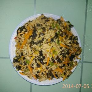 葱、姜、蒜、红辣椒切碎,胡萝卜、黑木耳切细丝。