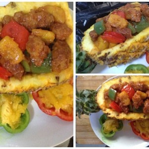 锅里留少许油,下青椒红椒炒出香味,下菠萝翻炒至出汁水,放进炸好的肉,加两大勺番茄酱,加大半碗清水,烧开以后大火收汁