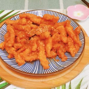倒入炸好的肉条,快速裹满酱汁,撒上白芝麻,关火。