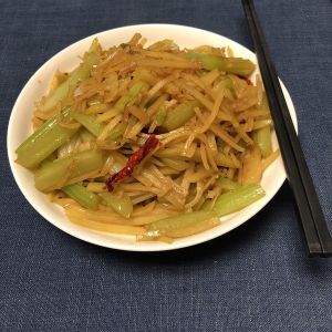 油热后,葱姜蒜爆锅。有香气后,放入香芹,略微炒一下,放入土豆丝,大火炒,加生抽和盐,只要土豆丝熟了,加点醋,然后就可以出锅了。