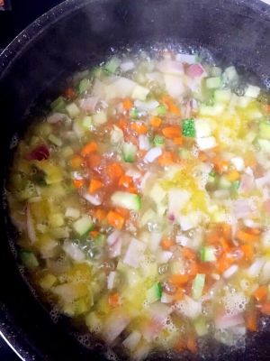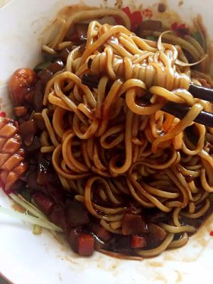 锅里放油,放入配料翻炒两三分钟,放水煮,水量不能太少,煮酱时也会干汤(炒时可适量放多点油,毕竟还要拌面