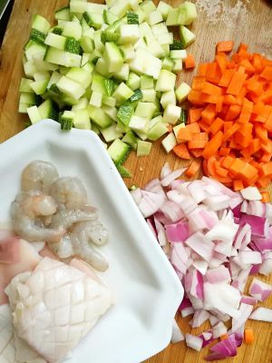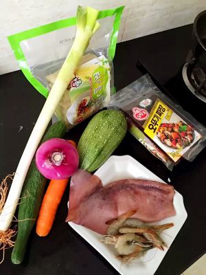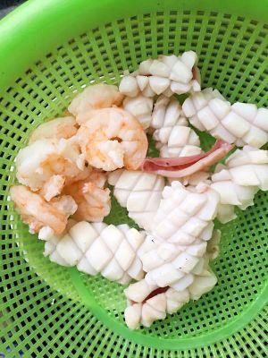 蔬菜切丁,鱿鱼和虾洗净,鱿鱼洗净切块割花(此时锅里烧水,水开后放入面,水开后再浇入凉水重复两遍直至面条煮好,捞起,凉白开冲洗两遍放凉后备用