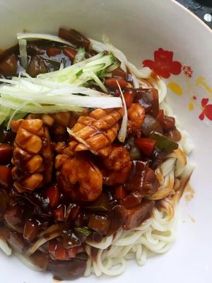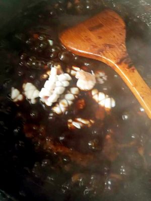 酱快煮好,也就是配菜已经煮至软烂时,放入备用的鱿鱼和虾翻煮(尝尝味道,淡了放盐,起锅前放适量味精