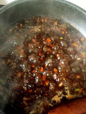 水煮十分钟后放入适量炸酱粉继续煮酱(炸酱粉的份量看着放,看着汤色适合,酱色浓郁即可