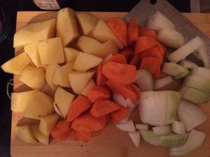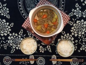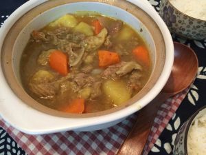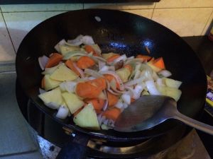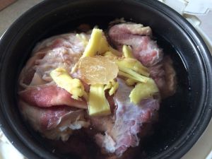 牛腩冲洗干净,连同姜及一小块冰糖一起放入电饭煲,开煮饭功能。
