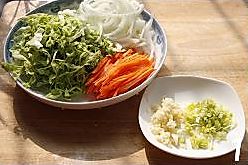 将圆白菜、胡萝卜、洋葱洗净切成丝,葱姜切末。
