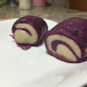 把发酵后的白面团揉好 杆成长条形的皮 同理 把紫薯面团揉好杆成长条的皮 上下叠放好 卷起来