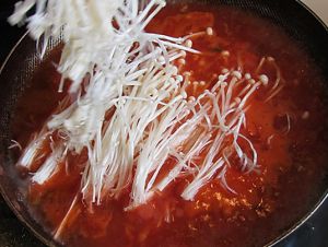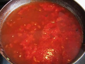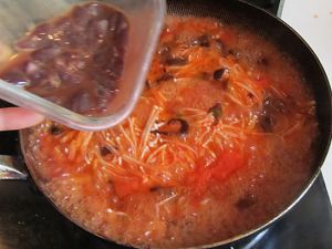加入番茄酱继续煸炒,. 再在熬好的番茄汁中加入适量的水,直到熬出红色的汁;
