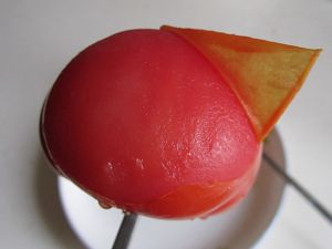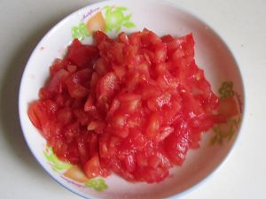 将番茄洗净后去皮, 将去皮的番茄切成小丁;