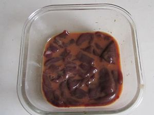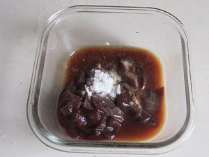 将切好的猪肝加入盐, 白胡椒, 料酒, 生抽, 生粉,