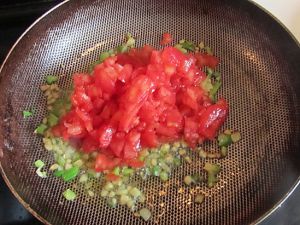 煸炒出香味后加入切好的番茄丁翻炒一下;