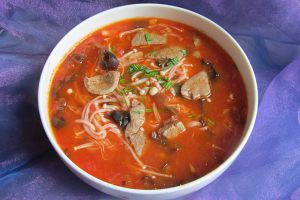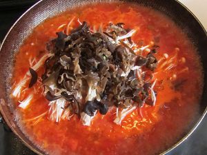 五分钟后下入腌好的猪肝;待煮开后加入盐, 胡椒等调料, 就可以关火了。