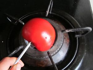 将一根筷子从番茄底部插进去, 最好选择不锈钢筷, 如果没有, 木制筷子要经过水泡一个小时;打开煤气灶,开火, 将番茄放在上面烤一下;