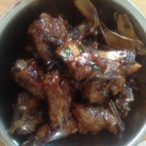再锅里热油,到油七分热的时候把姜,蒜头和葱花放进锅里爆香,等到香味出来再把烫过的排骨放进锅里翻炒几分钟,然后把调好的酱料倒进锅里,转大火煮开,再转小火炖到快没汁就可以出锅装盘了!