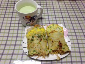 感觉饼有点熟的时候,就是捏饼软软的湿湿的,打一个鸡蛋铺平(先把蛋黄用铲子弄一下,和蛋清和在一起),让每一块饼上都有蛋液。然后撒上香葱。