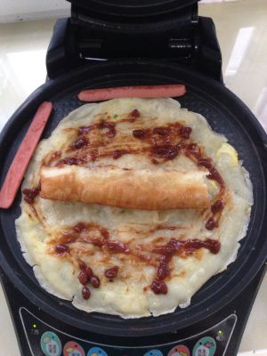 把饼翻过来,有鸡蛋的那一面翻到下面,然后在白饼上放上油条,刷上海天黄豆酱,我喜欢把火腿肠放在一边看烤一下。