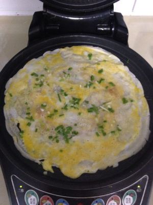 面粉加水和稀,倒在电饼铛里面,铺平,薄薄一层不要太厚。